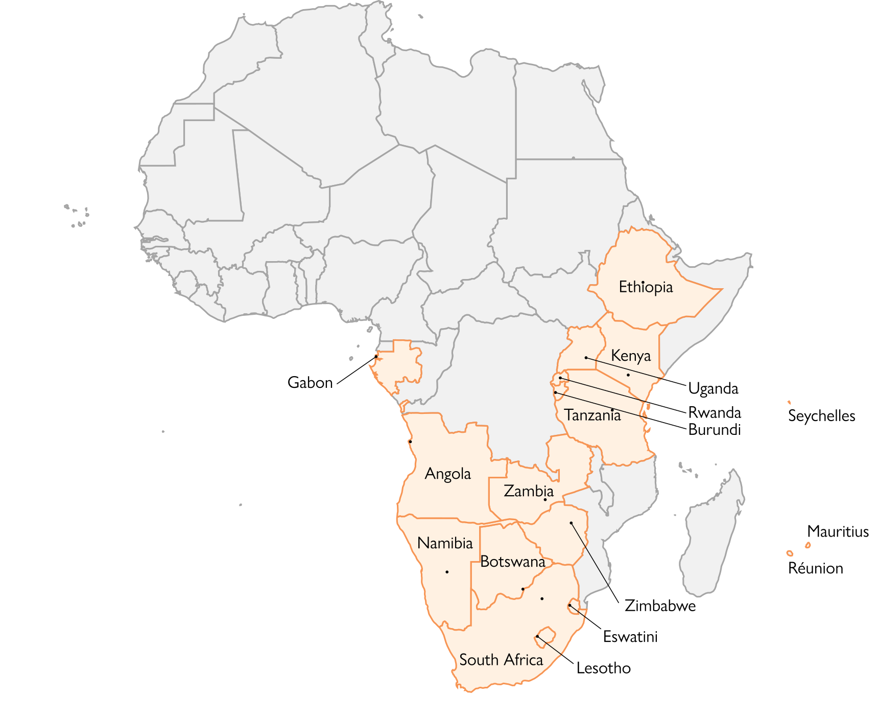Angola, Botswana, Burundi, Ethiopia, Eswatini, Gabon, Lesotho, Mauritius, Namibia, Réunion, Rwanda, South Africa, Seychelles, Uganda, Zambia, and Zimbabwe